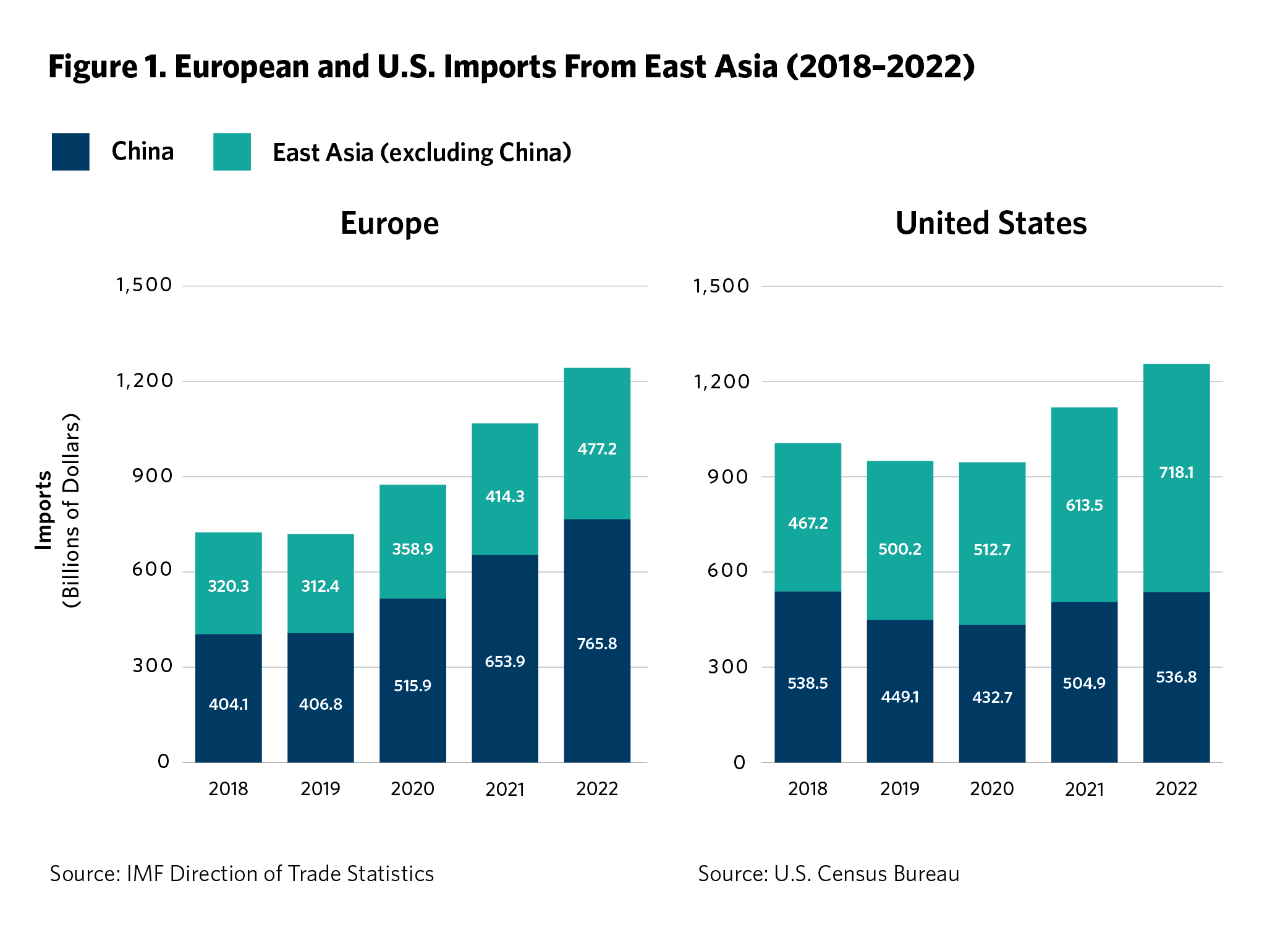 Differences in trade relations explain why Europe favors a more nuanced approached than the United States. As illustrated in figure 1, Trump’s trade war with China, which began in 2018, led to a decline in U.S. merchandise imports from China followed by a modest recovery. Meanwhile, U.S. imports from the rest of the world—including the other countries in East Asia—surged. China’s share of total U.S. imports declined to 16.5 percent by 2022, compared with 21.6 percent at the beginning of the trade war. As the United States relied increasingly on trade with other East Asian counties, China’s share of U.S. imports from East Asia fell from 54 percent to 43 percent.