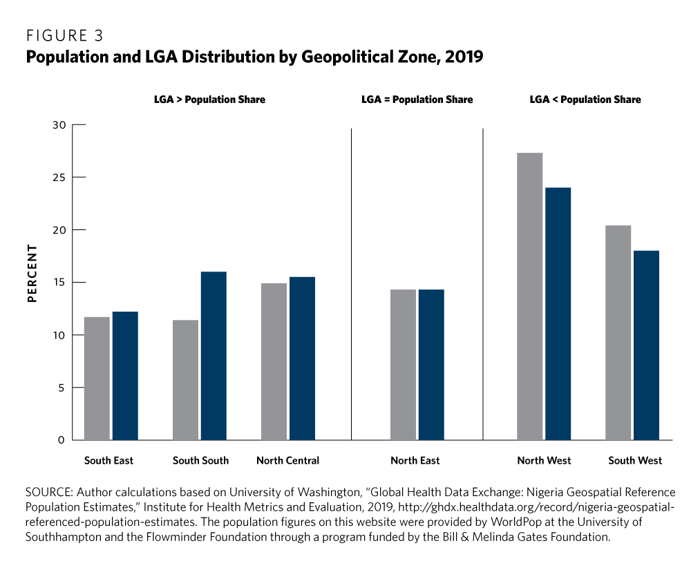 If viewed region by region, the disconnect between population and local government distribution is clear. The South South, South East, and North Central zones, for example, all have proportionally more LGAs than they do population, while the situation is reversed in zones such as North West and South West (see Figure 3).