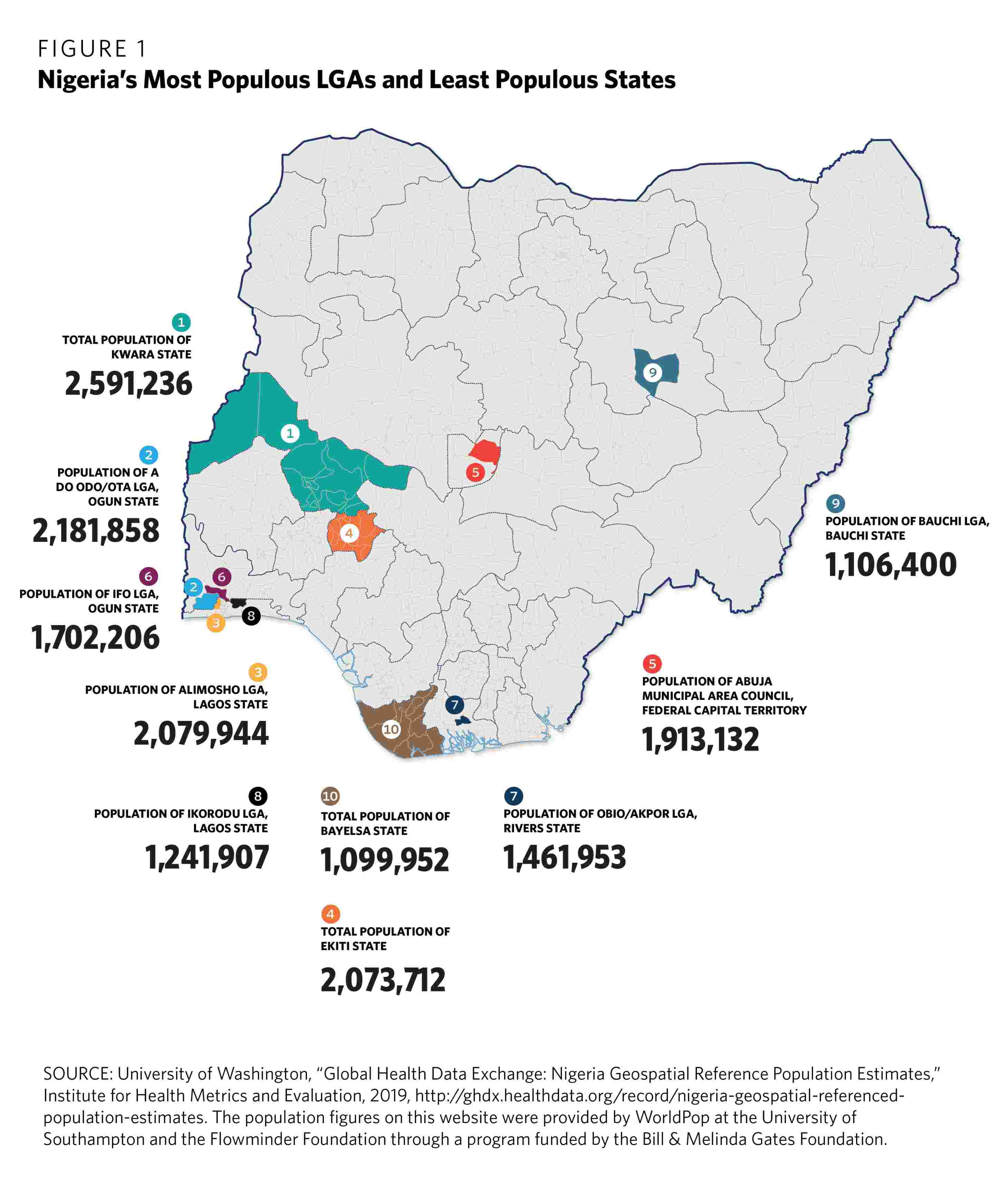 This means local government structures have not adapted to twenty-five years of population growth, urbanization, or internal displacement caused by conflict or climate change.30 Indeed, according to 2019 estimates, the populations of several LGAs now exceed the total populations of some states (see Figure 1), while the populations of LGAs in parts of rural Borno State are significantly lower due to internal displacement caused by the Boko Haram insurgency.31