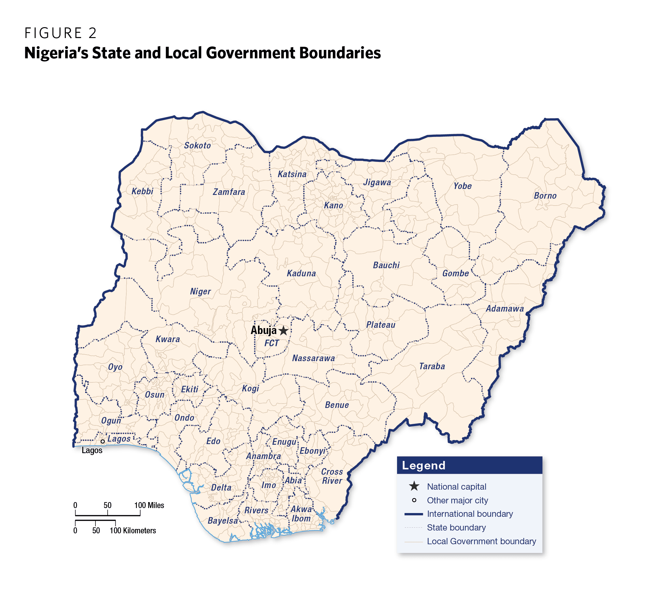 Nigeria’s third tier of government consists of 774 units—768 local government areas (LGAs) located across the thirty-six states and six area councils located in the Federal Capital Territory (FCT).15 The number of LGAs in a particular state depends on its geographic size and population. Kano State has the most LGAs (forty-four), while Bayelsa State has the fewest (eight). The numbers and names of Nigeria’s LGAs are stipulated in the constitution.16 Each LGA has delineated boundaries and a designated headquarters where its main administrative building (secretariat) is located.