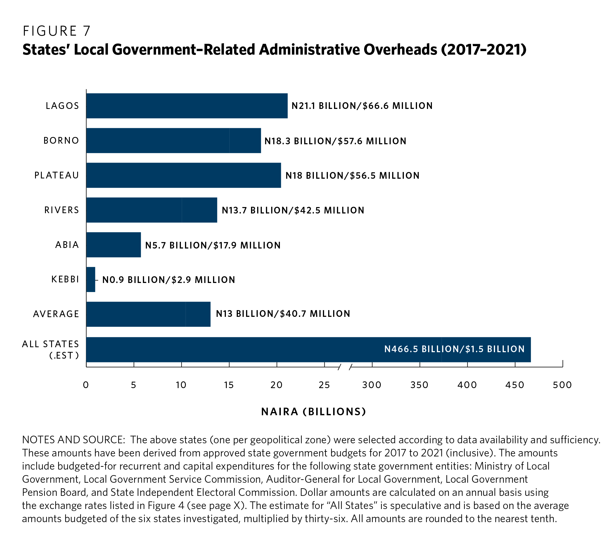 Over time, such malfeasance has served to deprofessionalize tens of thousands of local government workers.121 In the opinion of one civil society representative, most of these workers “have no goals, no objectives, nothing they want to accomplish . . . [and] think of local government as nothing more than an opportunity to get paid to do nothing.”122 Low wages (see Figure 5), poor leadership, and terrible working conditions have prompted more skilled and capable staff to take state or federal jobs or leave for the private sector.123 In 2021 alone, local government workers in Edo, Kogi, Niger, and several other states were paid late or only partially, thereby damaging morale, threatening livelihoods, and sparking absenteeism.124 Unfortunately, such human resource challenges cannot be fixed quickly but will instead require years of sustained reform and investment.