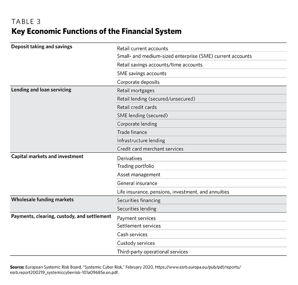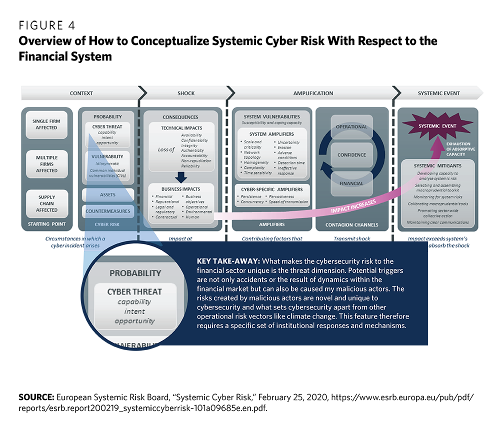 In April 2020, the Financial Stability Board (FSB) cautioned that “cyber incidents pose a threat to the stability of the global financial system.” The FSB went on to warn that the last few years have seen “a number of major cyber incidents that have significantly impacted financial institutions and the ecosystems in which they operate. A major cyber incident, if not properly contained, could seriously disrupt financial systems, including critical financial infrastructure, leading to broader financial stability implications.”11 The potential economic costs of such events can be immense and the damage to public trust and confidence significant. Cyber incidents could potentially undermine the integrity of global financial markets;12 equally important, the exploitation of cyber vulnerabilities could cause losses to investors and the general public. Central to the risk is the fact that the global financial system is a complex adaptive system. It is resilient and able to absorb most of the shocks that regularly occur, but its complexity also means that large shocks, although rare, can quickly ripple in unpredictable ways. The system’s complexity also makes it impossible to predict exactly when or how such systemic shocks will occur.13 But one thing is clear: it is not a question of if a major incident will happen, but when.