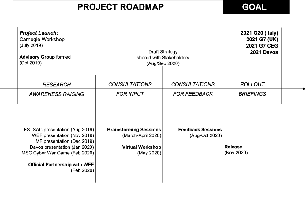 Written by Carnegie experts, this document includes feedback obtained through consultations with more than 200 stakeholders in government, the financial regulatory community, industry, and academia. An international advisory group, formed in fall 2019, provided strategic advice throughout the project. In February 2020, following Carnegie’s presentation of this project at the Forum’s annual meeting in Davos the previous month, the World Economic Forum became an official partner.