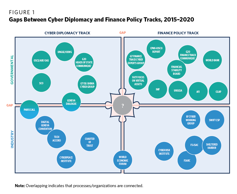 A good illustration of these continuing gaps and the need for greater coordination among the different stakeholders is the G7 itself. Although it has demonstrated international leadership on this issue through the G7 Finance Track’s CEG, there is room for improvement. For example, the G7 Finance Track’s CEG and the diplomat-led G7 cyber norms group have never met since their creation in 2016, despite clear general synergies and specific crosscutting challenges. Figure 1 illustrates such gaps between the cyber diplomacy and finance policy tracks.