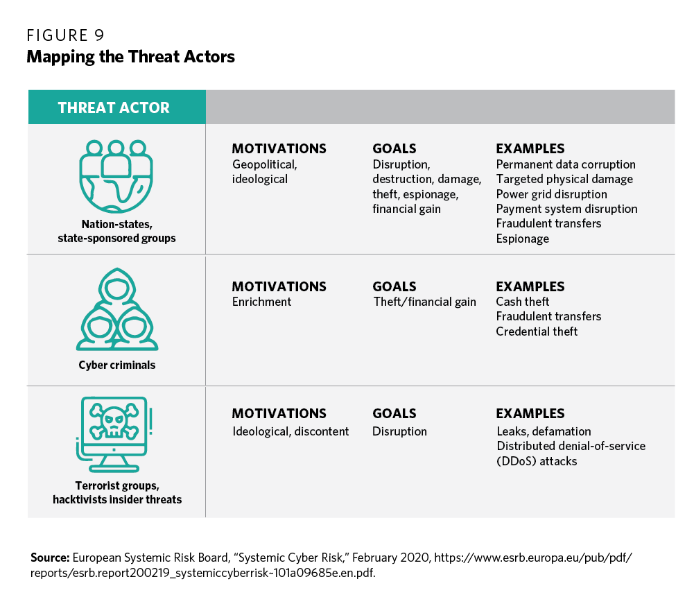 Surprisingly, despite the global financial system’s increasing reliance on digital infrastructure, it is unclear who is responsible for protecting the system against cyber attacks. In part, this is because the environment is changing so quickly. Everybody agrees that the global financial system is critical to society, the global economy, and the recovery from the pandemic. Yet the global financial sector remains vulnerable to cyber threats and, absent dedicated action, will only become more vulnerable as innovation, competition, and the pandemic further fuel the digital revolution. Although many threat actors are focused on making money, the number of purely disruptive and destructive attacks has been increasing; furthermore, those who learn how to steal also learn about the financial system’s networks and operations, which allows them to launch more disruptive or destructive attacks in the future (or sell such knowledge and capabilities to others). This rapid evolution of the risk landscape is taxing the responsiveness of an otherwise mature and well-regulated system.