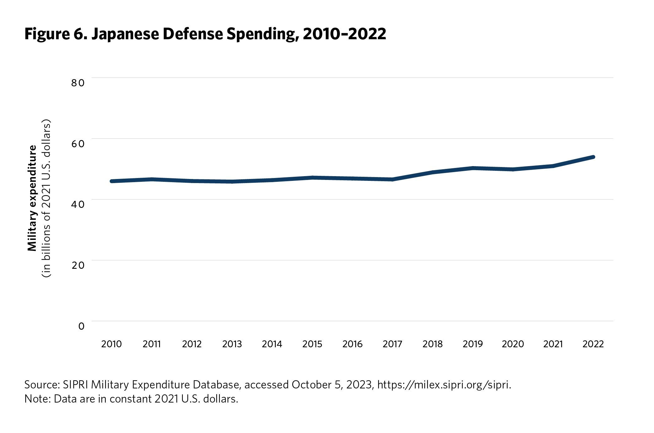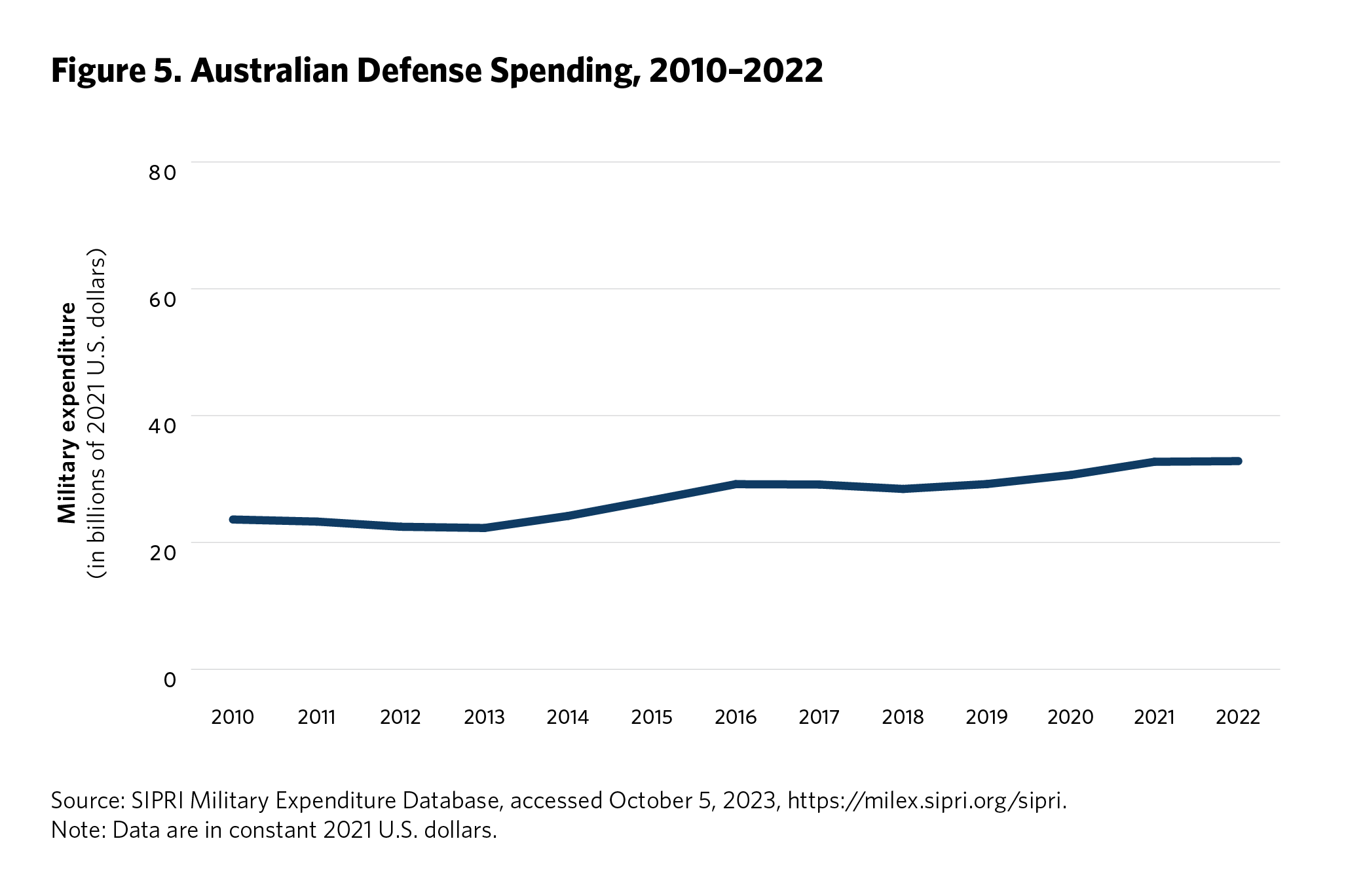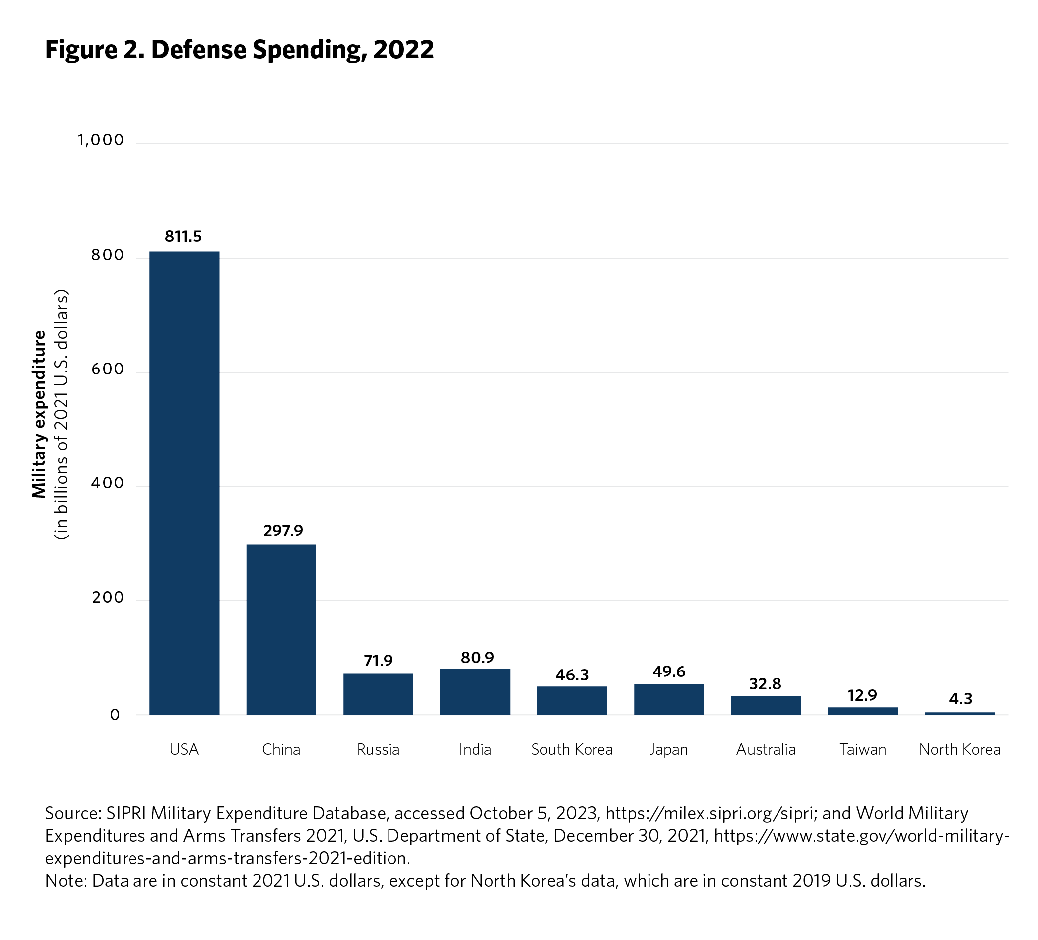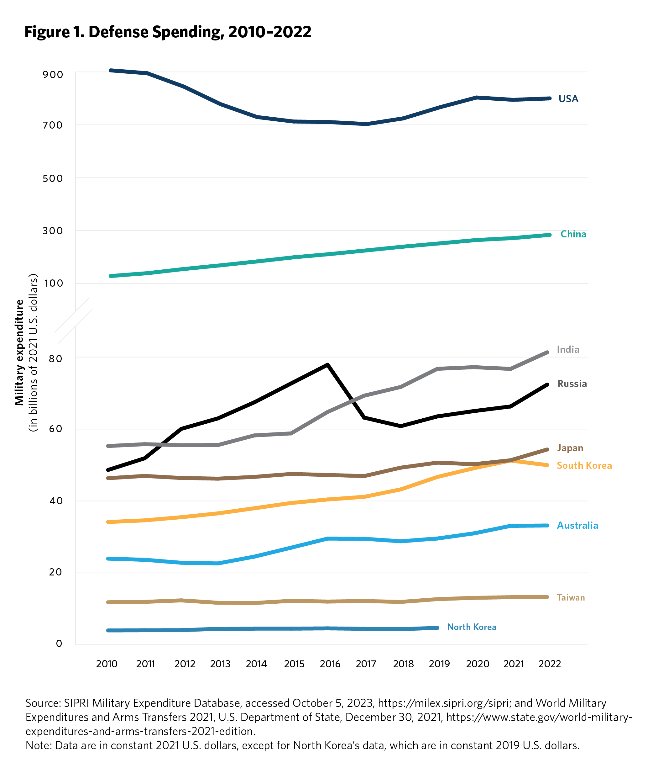 The proliferation of missile capabilities in Asia accompanies a broader surge in regional defense spending since the 2010s (see figures 1 and 2).5 The primary pursuers of significant new missile capabilities in East Asia—Australia, China, Japan, North Korea, South Korea, Taiwan, and the United States—all perceive acute security challenges and see value in long-range strike capabilities for deterrence and conventional warfighting alike. Four of these—Australia, Japan, South Korea, and Taiwan—are U.S. partners, and all but Taiwan are beneficiaries of treaty-codified collective defense arrangements.6 Along with the United States, these partners have particular concerns about China’s regional ambitions and, with the exception of South Korea, are primarily pursuing missile capabilities to deter potential conventional military action against their interests by Beijing. South Korea, which has maintained a robust domestic missile development program since the second half of the Cold War, continues to primarily posture its forces to deter North Korean nuclear and conventional attacks, but over time it could take a more forward-leaning stance against China as well. A permeating, background concern for many of these allies continues to be long-term uncertainty about the reliability of the United States’ extended deterrence commitments—a concern that grew salient in 2017–2021 when former U.S. president Donald Trump sometimes pursued an unorthodox approach to alliances. For these allies, the acquisition of new strike capabilities, while complementary to existing U.S. capabilities in an alliance context, also hedges against an uncertain future.
