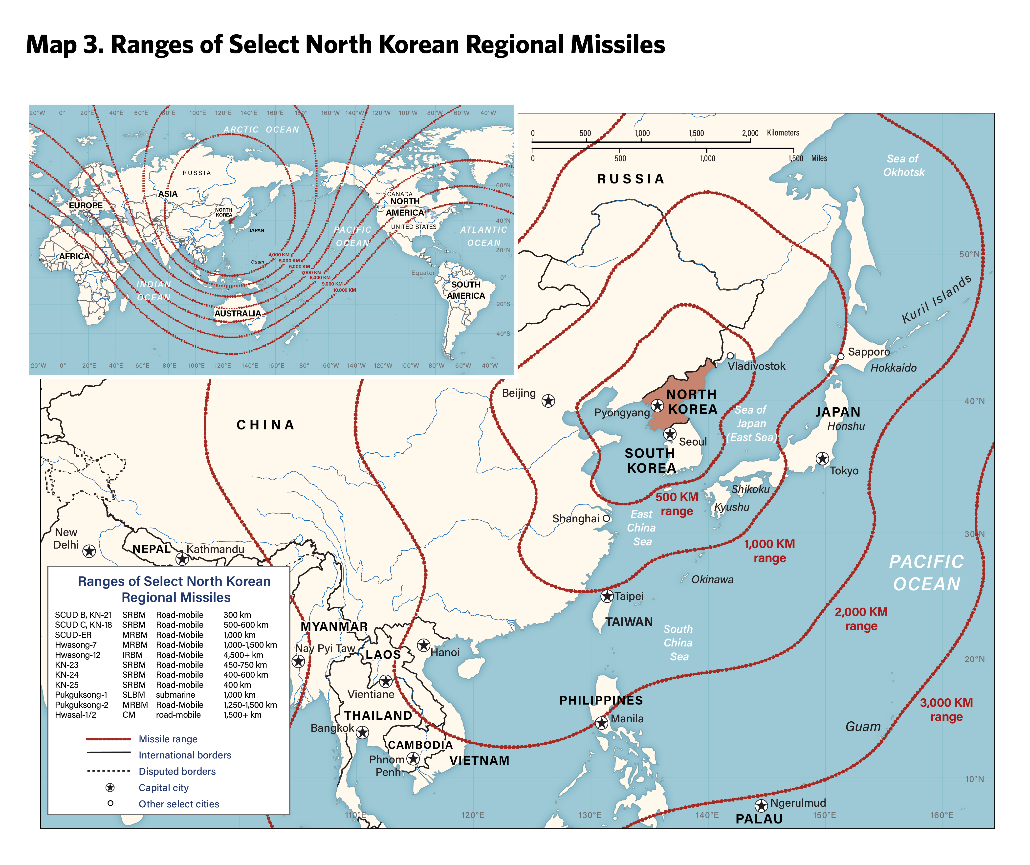 1 In general, short-range missiles are those with ranges between 300 kilometers and 1,000 kilometers, medium-range missiles are those with ranges between 1,000 kilometers and 3,000 kilometers, and intermediate-range missiles are those with ranges between 3,000 and 5,500 kilometers.