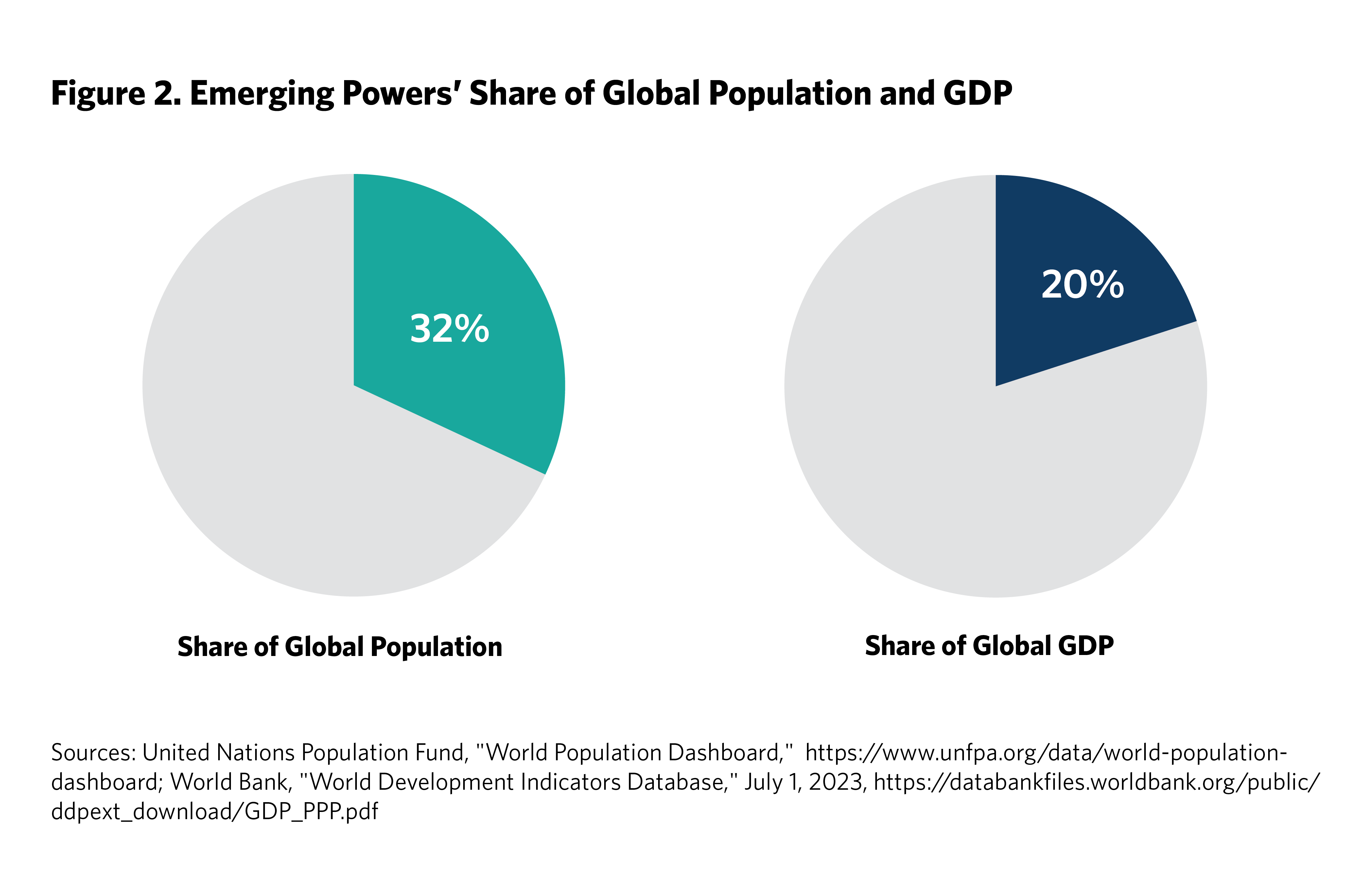 To determine what approach the United States should take toward emerging powers, this report looks at ten of the most important emerging powers in economic and strategic terms. They are part of what is often called the Global South, spanning Africa, Asia, Latin America, and the Middle East. They make up about a third of the world’s population and a fifth of its economic production (see figure 1).1 They include three members of the original BRICS—Brazil, India and South Africa—and five other members of the G20: Argentina, Mexico, Indonesia, Saudi Arabia, and Türkiye (see box 1).2 The other two countries included in this report are Nigeria and Thailand.